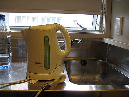 我們的房間以淺藍色的油漆為背景,家具走白色基調,整體感覺非常舒適。最讓人感到不可思議的是,小小的房間裡面各種設備應有盡有。衛浴間(有附肥皂、沐浴乳和毛巾)、小廚房(含電爐、微波爐、冰箱、煮水器、茶包咖啡包及杯盤、熨斗及燙衣板)、兩張床(床邊有抬燈)、電視音響設備及收音機、可開落地窗門通到外面的迷你陽台。對於西方人來說可能不習慣這樣的房間尺寸,但是相較於一些日本的旅館,這樣的空間已經算寬敞了,而且也不會造成活動的不便。